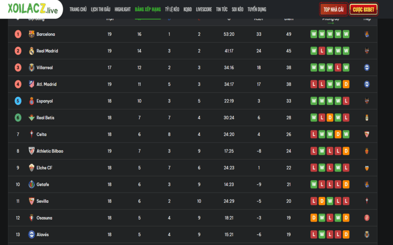 La Liga luôn mang đến màu sắc rất riêng với sự đối lập giữa lối chơi kỹ thuật và tính thực dụng. Bảng xếp hạng giải đấu này không chỉ xoay quanh Real Madrid hay Barcelona, mà còn phản ánh sự vươn lên của nhiều đội bóng giàu tham vọng khác.